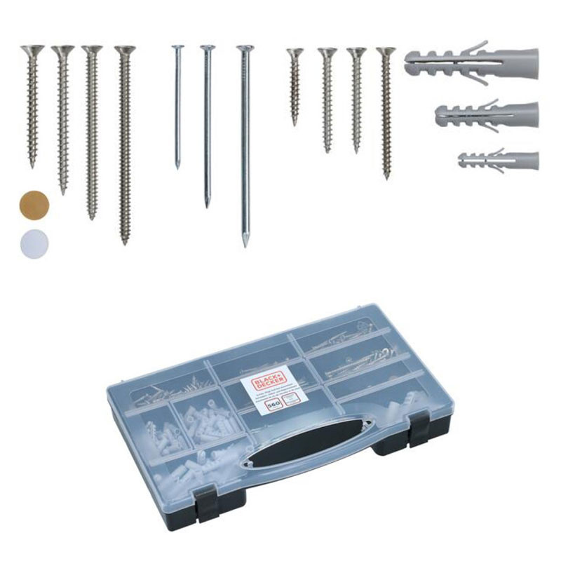 BLACK+DECKER 560 darabos, csavar, tipli és szög készlet praktikus műanyag tárolódobozban, mely alkalmas barkácsolóknak és szakembereknek egyaránt. A doboz tartós műanyagból készült, így könnyen szállítható és tárolható.
