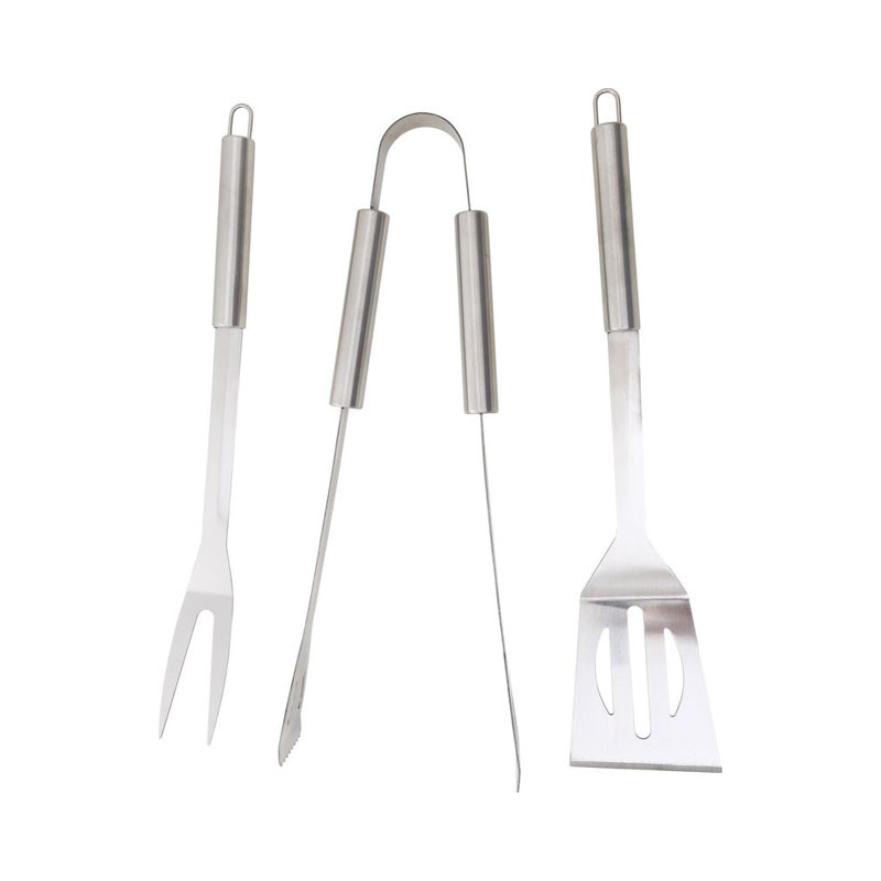 Háromrészes, rozsdamentes acélból készült grillező eszközkészlet, amely tökéletes társ grillezéshez, BBQ partikhoz vagy kerti sütögetésekhez. A készlet tartalmaz egy húsvillát, egy lapátot és egy csipeszt – mindegyik ergonomikus, hőálló nyéllel és akasztófüllel van ellátva a kényelmes használat és tárolás érdekében.