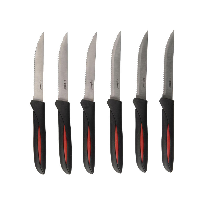 6 darabos Alpina steak kés szett, mely ideális választás családi ebédekhez, kerti grillezésekhez vagy baráti összejövetelekhez. A rozsdamentes fém pengék és a praktikus műanyag markolatok kényelmes és biztonságos használatot biztosítanak minden alkalommal.