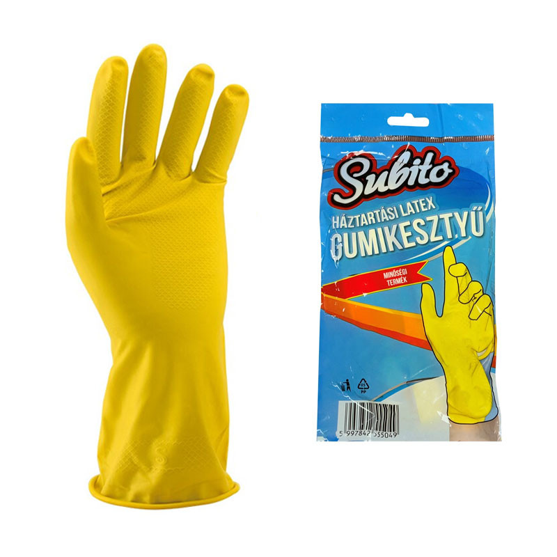 1 pár háztartási gumikesztyű. Jó fogást biztosít, tapadásmentes belsővel és csúszásgátló külsővel. Mosogatáshoz, fürdőszobai használatra, ház körüli munkához ajánljuk.