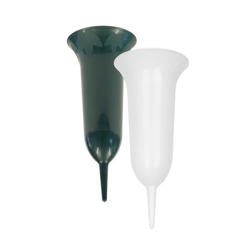 Leszúrható műanyag sírváza, mely jól alkalmazkodik az időjárás viszontagságaihoz. Praktikus kialakításának köszönhetően szálas virágok, csokrok tárolására tökéletesen alkalmas.
