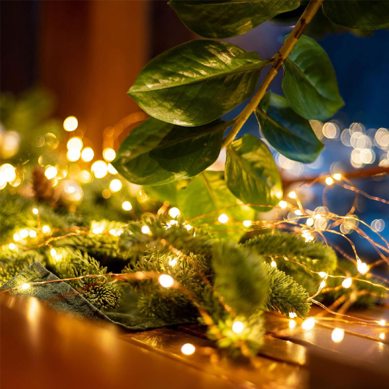 Beltéri fényfüzér 50 db melegfehér micro-LED-del, amelyek mindegyike fényesen ragyogó, pontszerű fényt bocsát ki. A vékony, átlátszó vezeték lehetővé teszi, hogy a fényfüzért bárhová feltűnésmentesen elhelyezze.